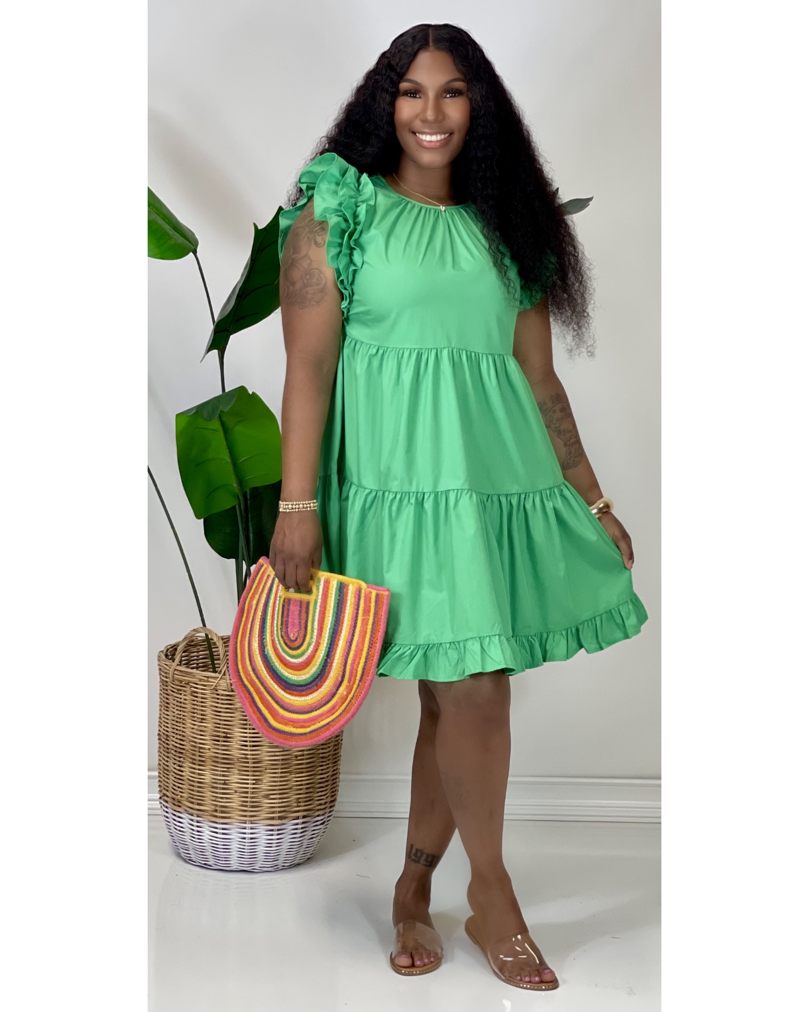 Ruffle sleeve tiered solid Dress. Model measurements Model is wearing size Medium Height: 5'6 Bust: 33 Waist: 25 Hip: 34