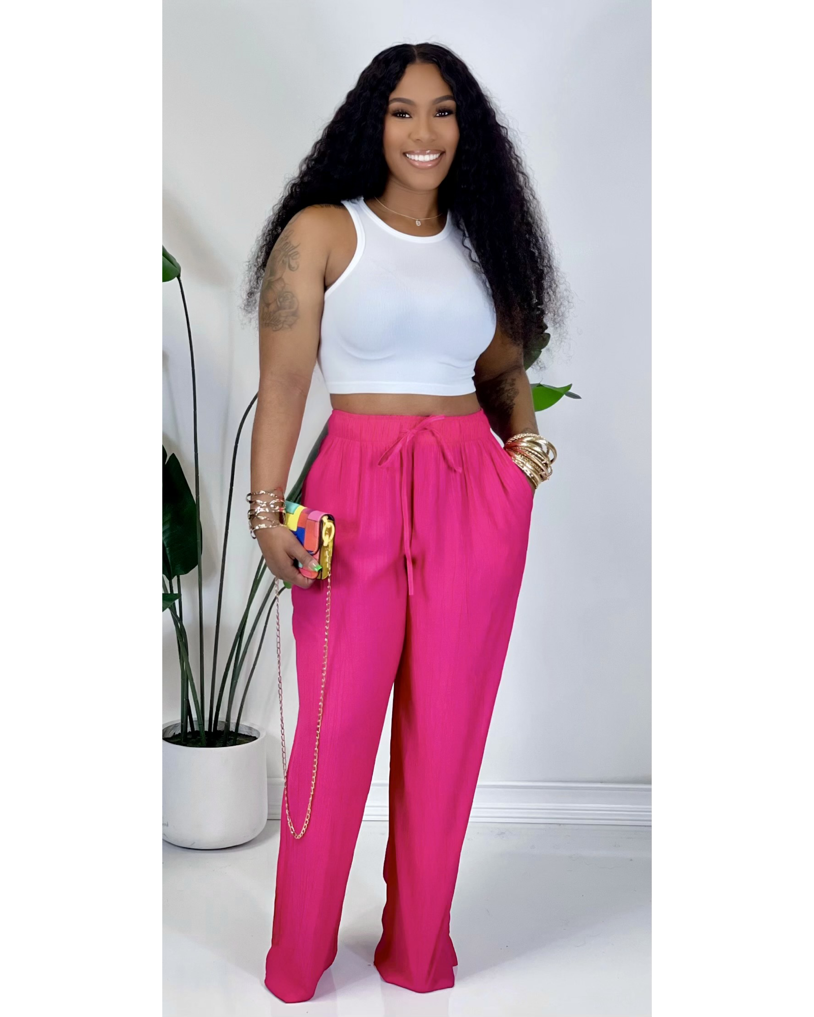 A textured linen nylon blend pants featuring a tie waist drawstring, wide leg, and a pork-chop pockets. Model is wearing size medium.