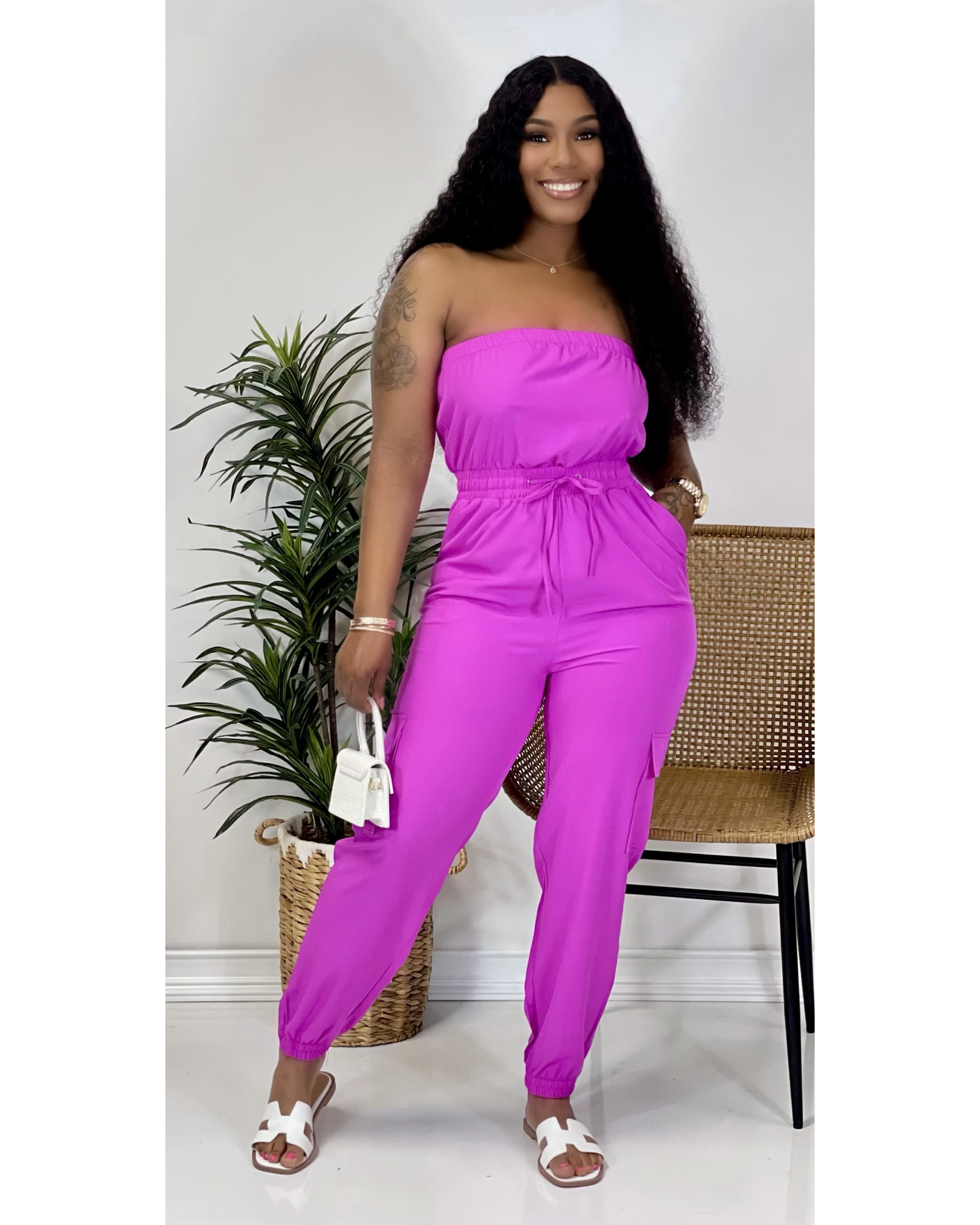 Strapless long jumpsuit with straight neckline. Side pockets and patch pocket at leg.