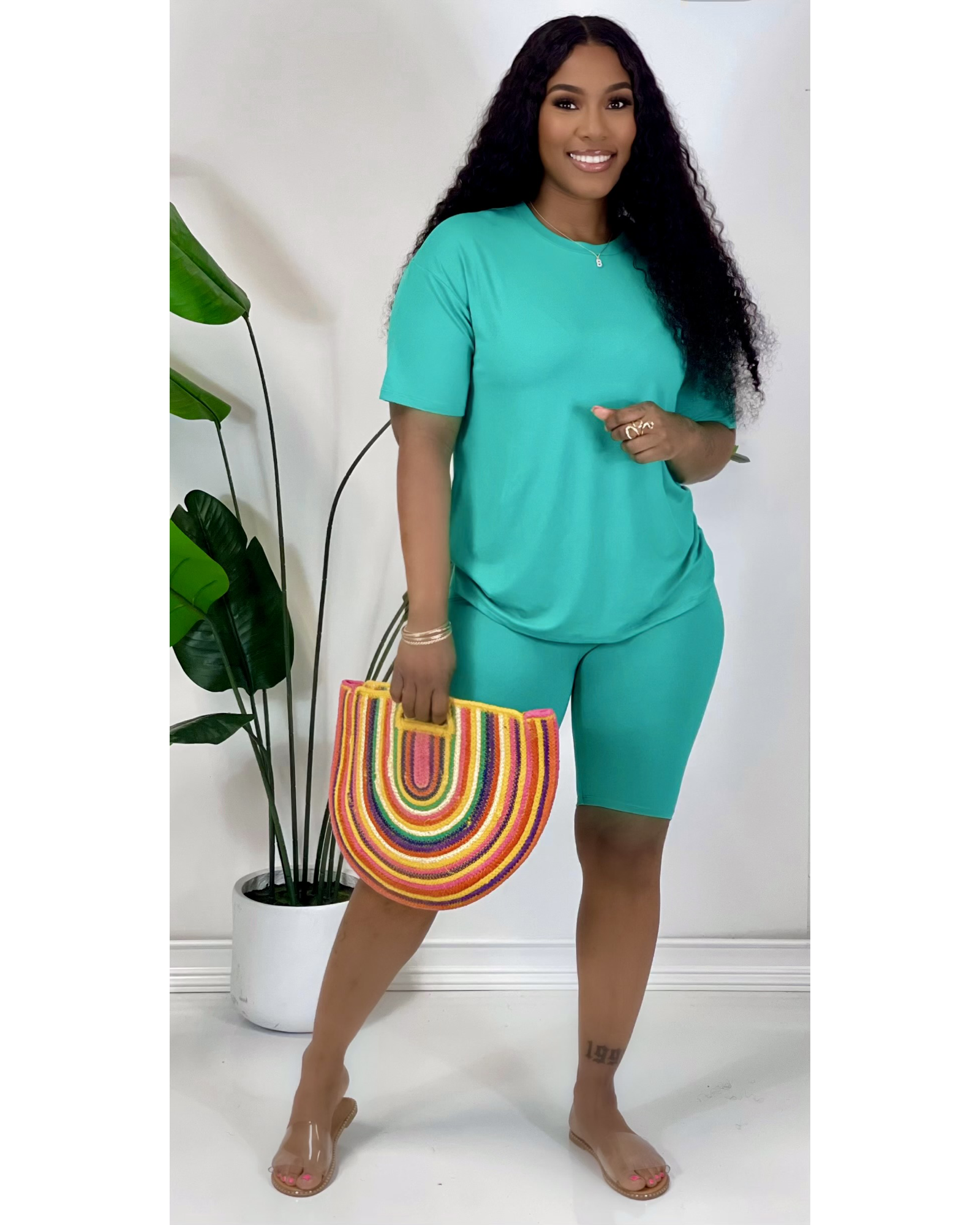 Brushed Dty Round Neck Basic T-Shirts Top and Bike Shorts Set