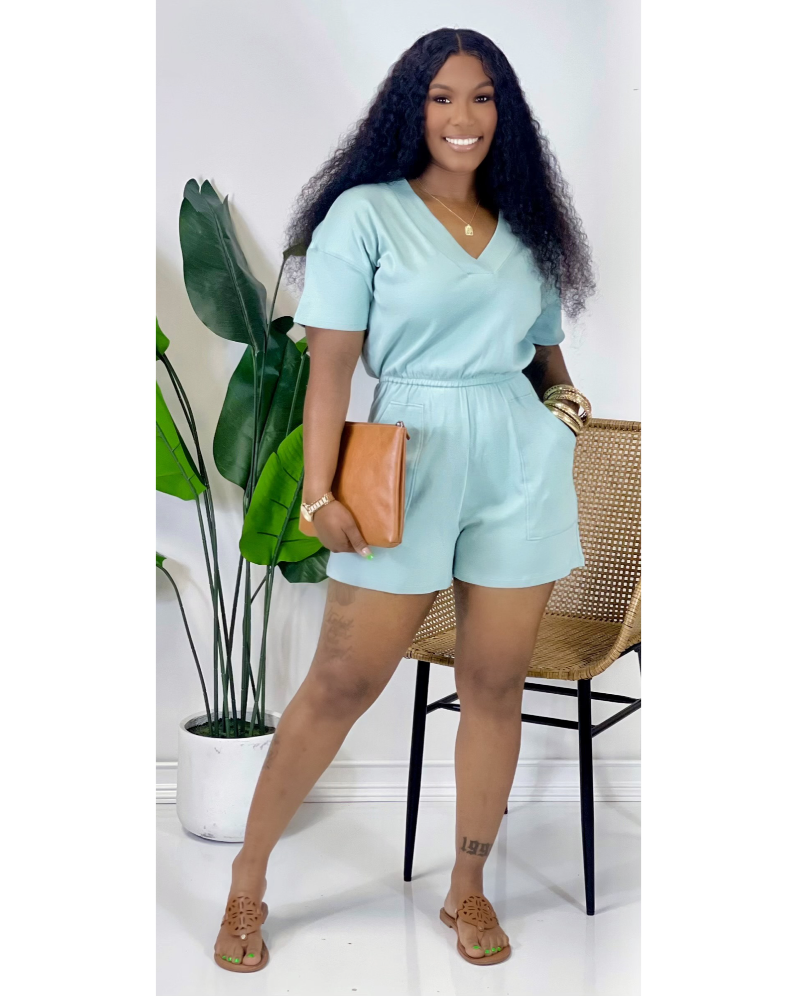 DROP SHOULDER V-NECK ROMPER WITH POCKETS TOTAL BODY LENGTH: 17.5"(FRONT TOP), BUST: 46", INSEAM: 4" approx. - MEASURED FROM SMALL