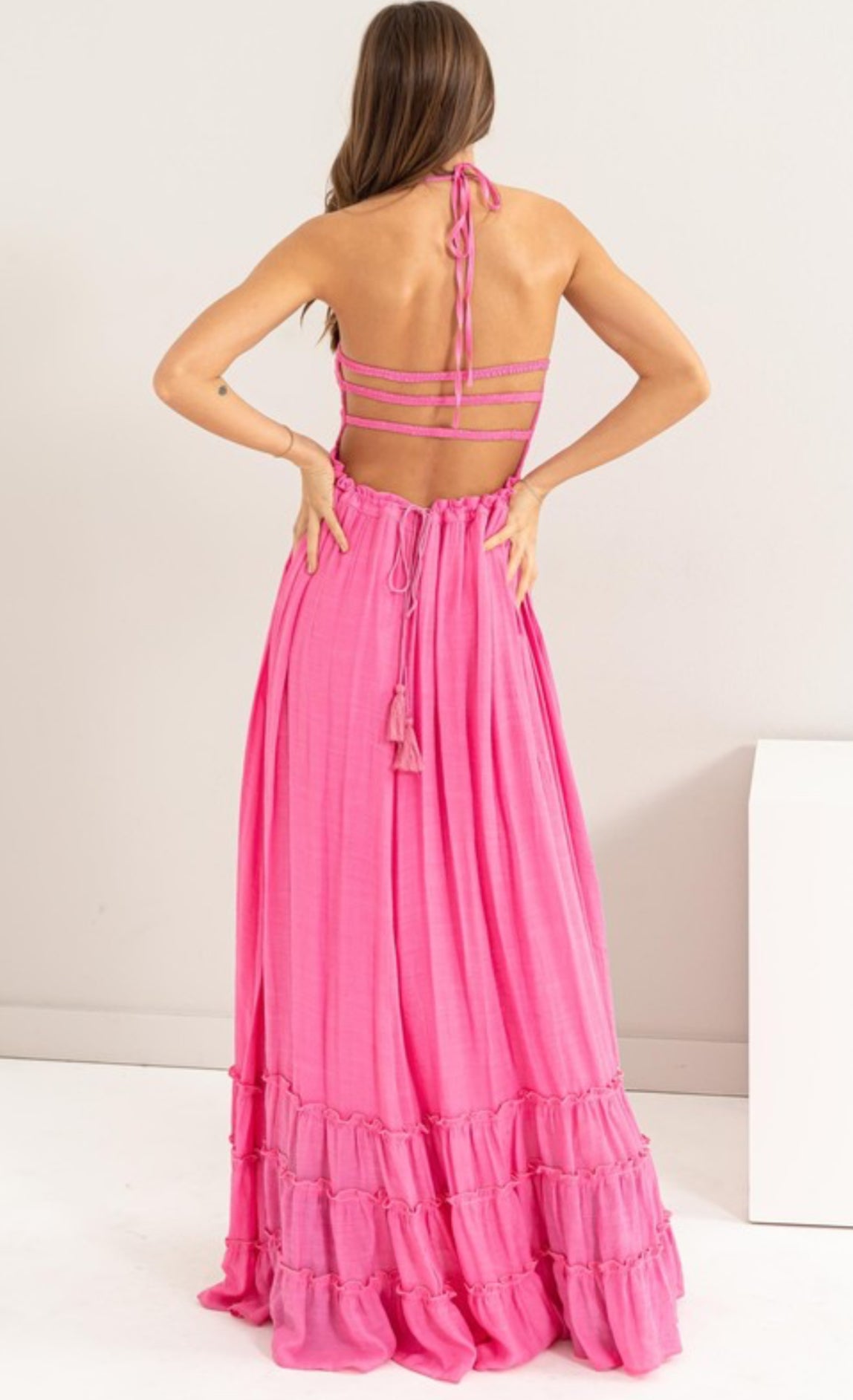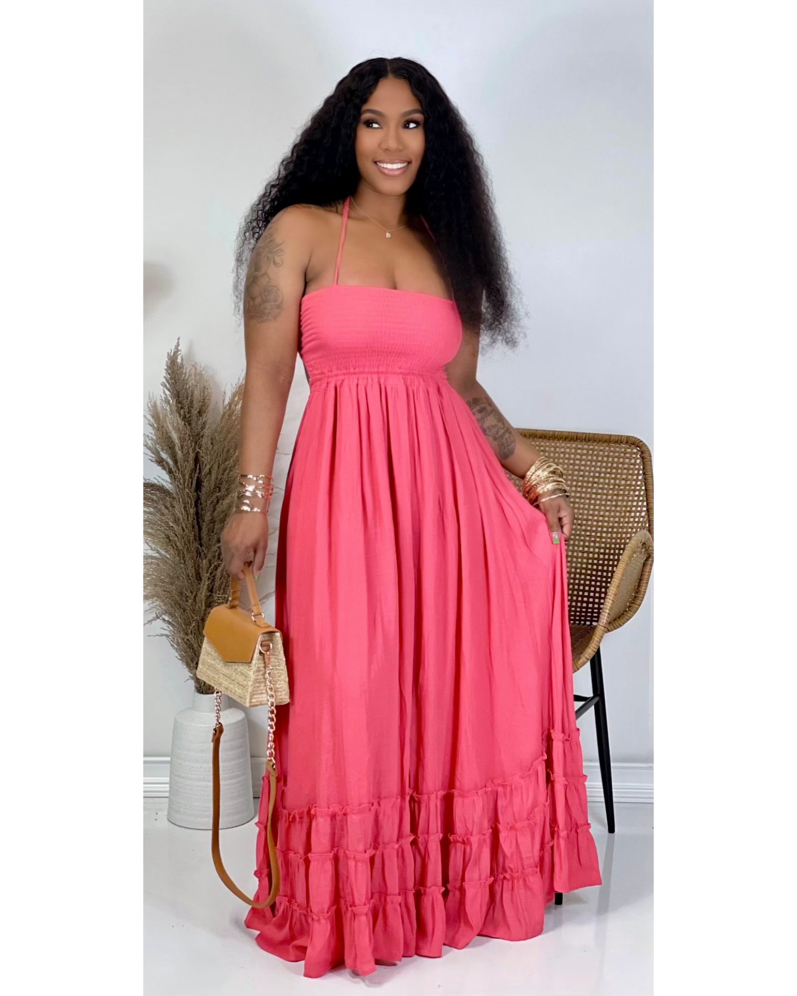 WITH BACK HALTER TIES AND A SMOCKED BODICE