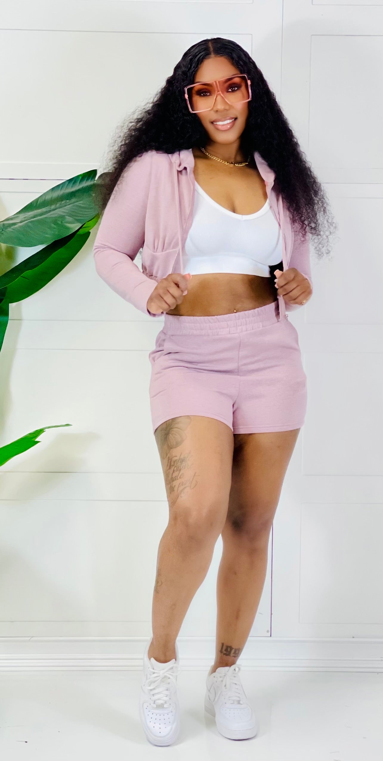 Top: A solid long sleeves crop top featuring a hood with self-tie drawstring, cuffed, elasticized hem, and zip-up front closure. Bottom: A pair of solid mini shorts featuring a high-rise elasticized waistband and front slant pockets. Model Wearing Medium