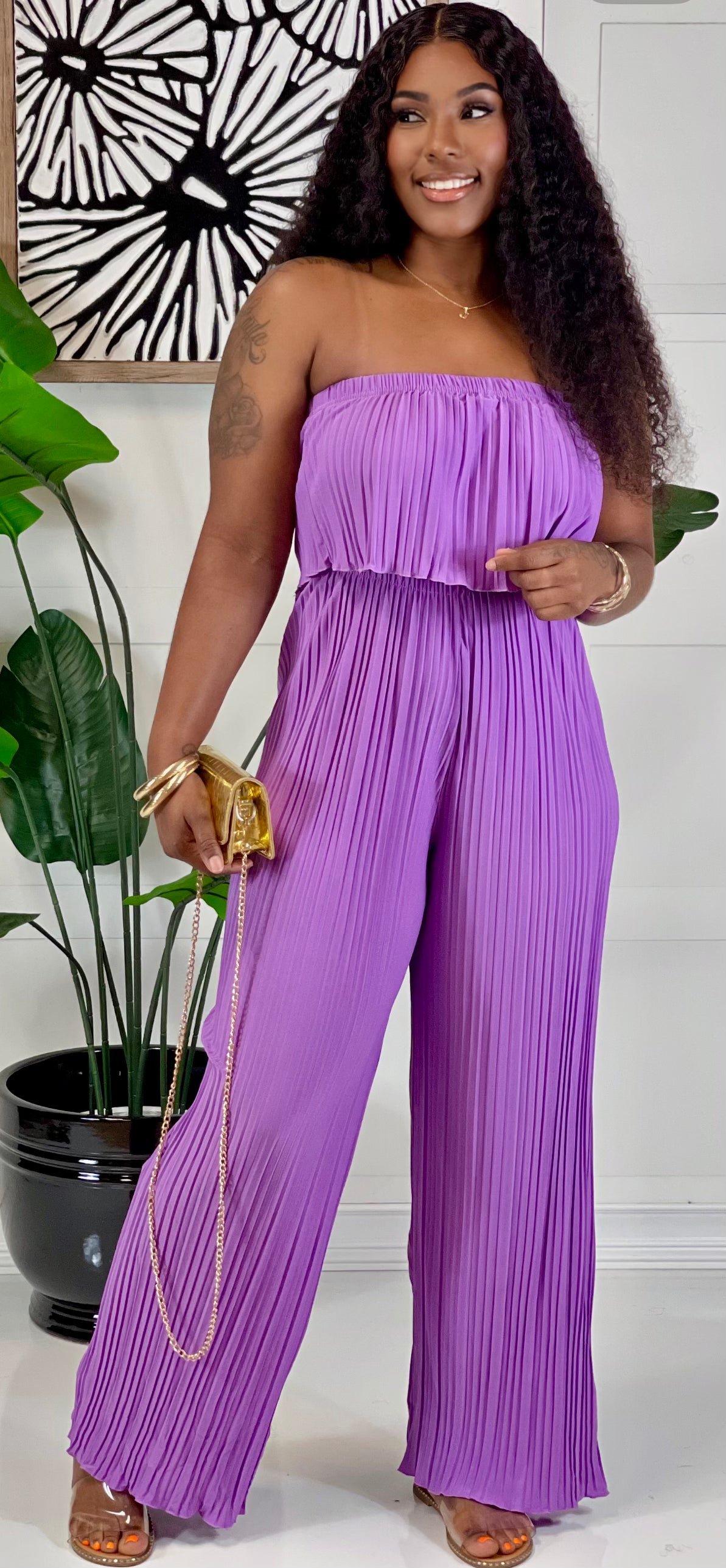 Crinkled Textured fabric -Sleeveless collared tank top -Elastic waistband pull on wide leg pants *Model is wearing a size medium*