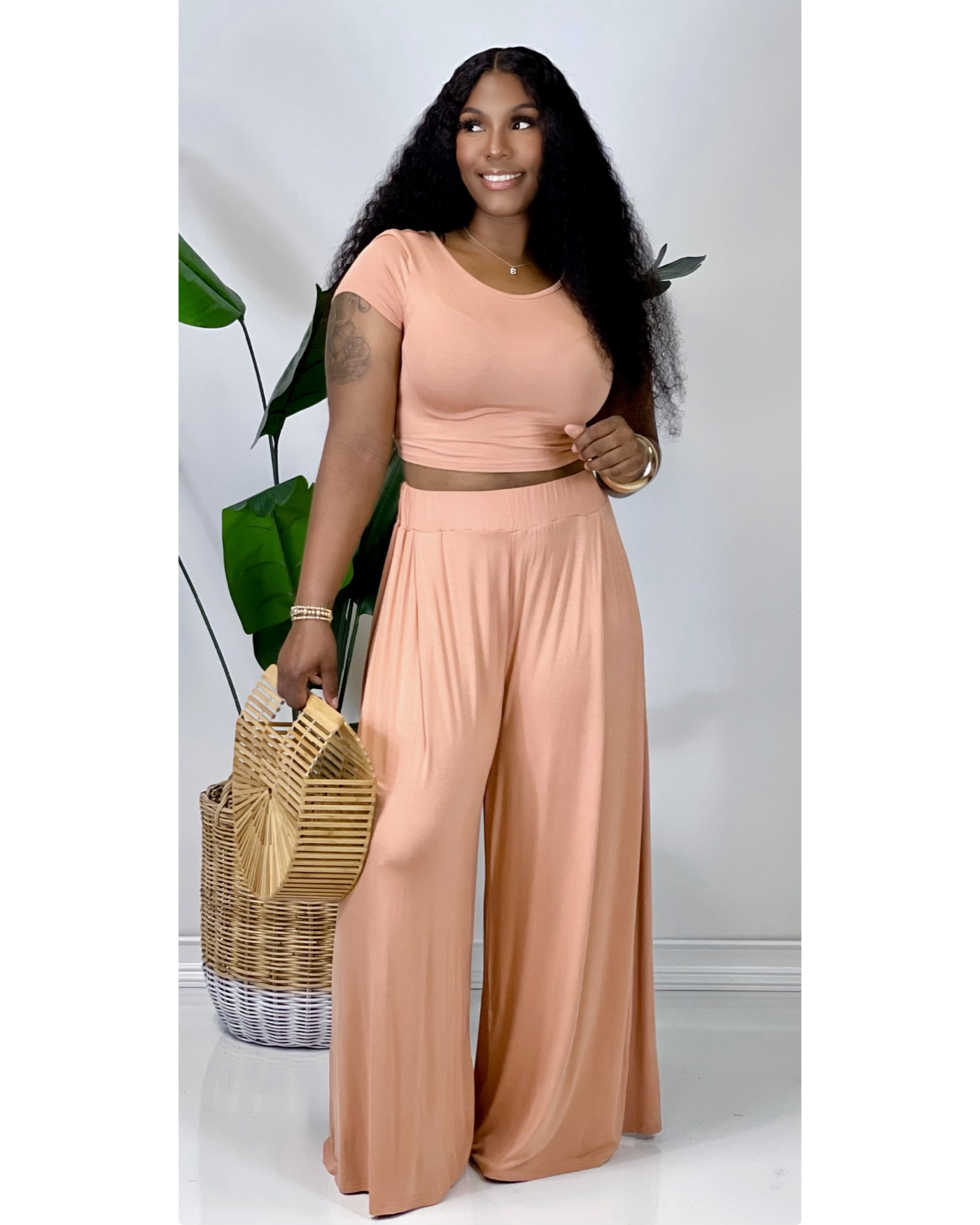 SHOWCASING KNIT CONSTRUCTION, THE TOP FEATURES A ROUND NECK, SHORT SLEEVES, AND A CLOSE FIT WITH OPEN BACK. MATCHING PANTS FALL FROM AN ELASTICATED HIGH WAIST INTO A FLOWY, WIDE-LEG SILHOUETTE THAT OFFERS EASE OF MOVEMENT. 95% RAYON 5% SPANDEX IMPORTED.
