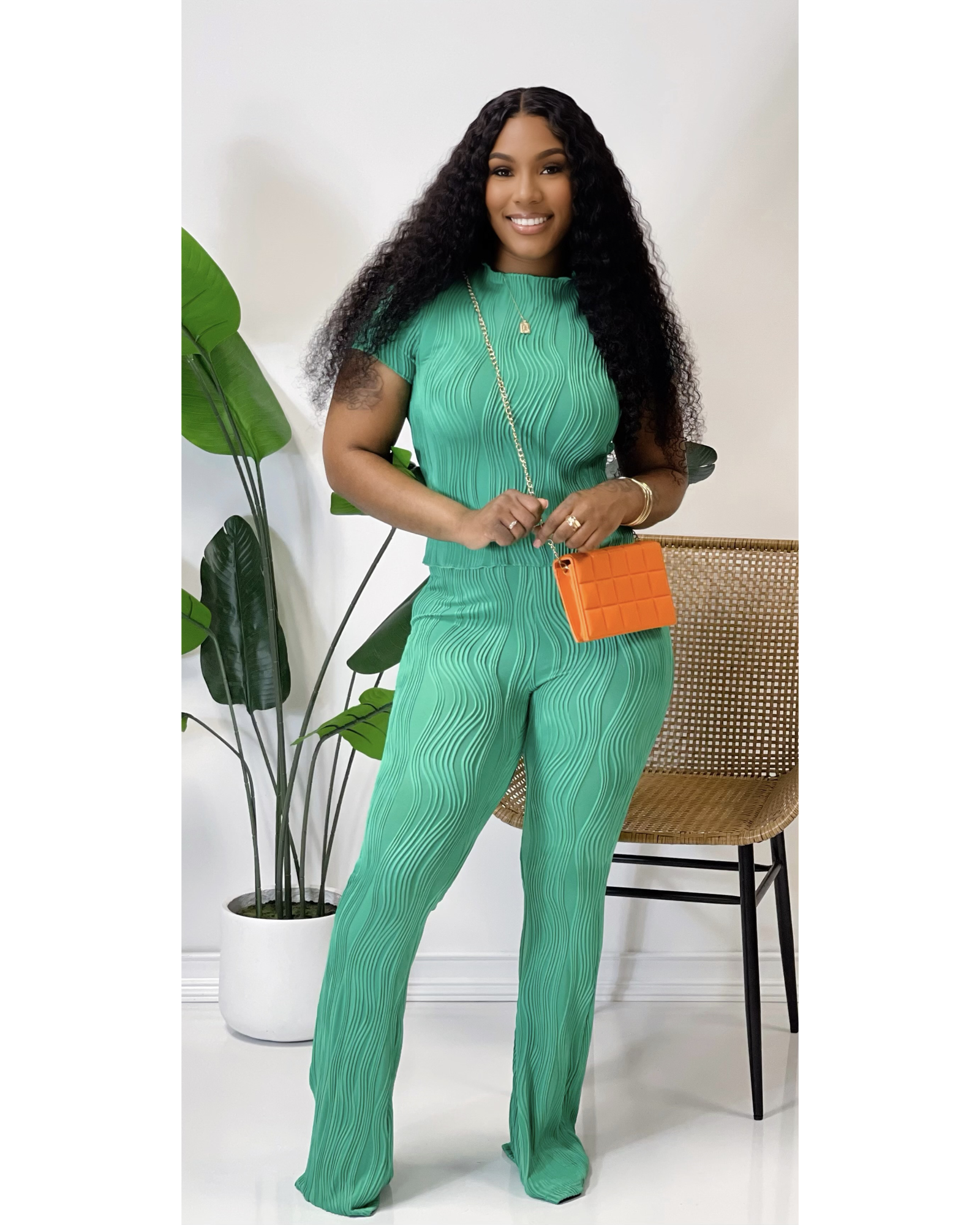 PRETTY PLEATED FLARE PANTS SET COMFORTABLE FIT STRETCHY HIGH WASIST ELASTIC WAIST 95% POLYESTER 5% SPANDEX MODEL IS 5'6" and WEARING MEDIUM SIZE.