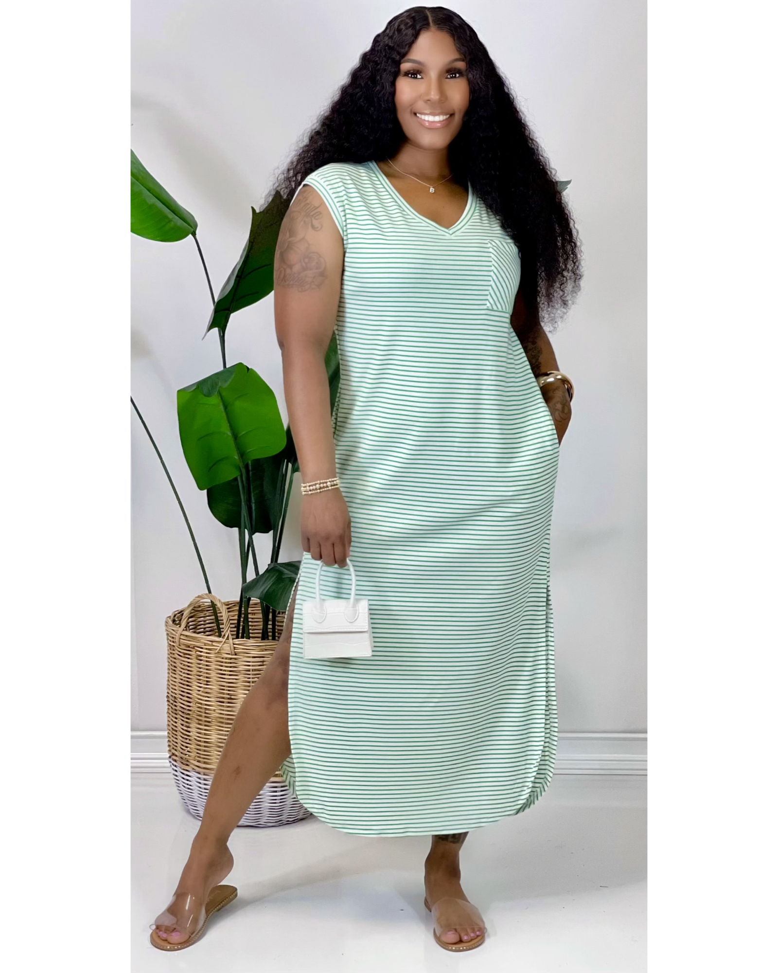 V Neck Oversize Sleeveless Stripe Maxi Dress V Neck -Oversize -Sleeveless -Stripe -Maxi Dress -Pockets -Relaxed Fit -Loose Fit -66% Rayon 29% Polyester 5% Spandex