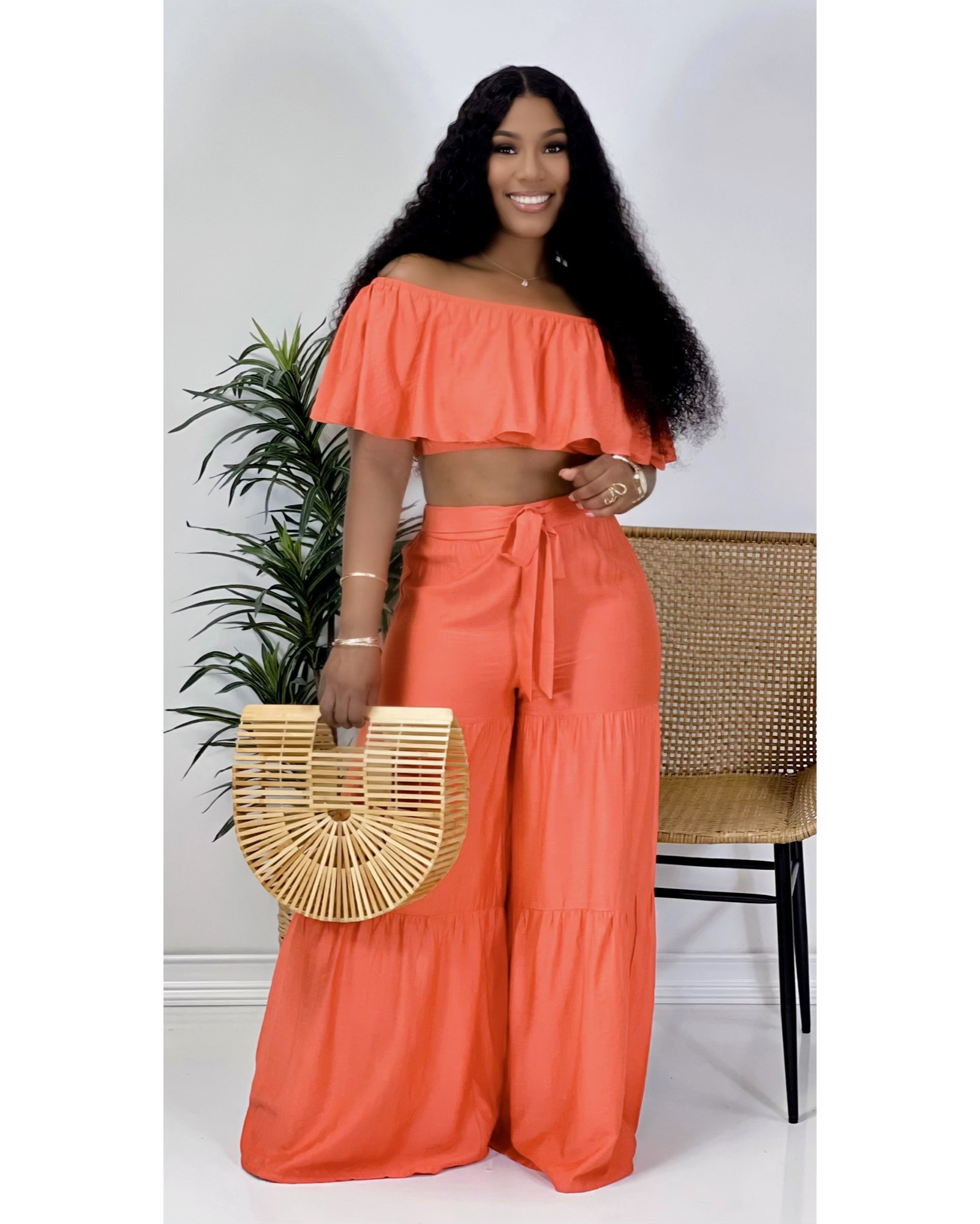 Off Shoulder Top With Wide Leg Ruffle Hem Pants Set