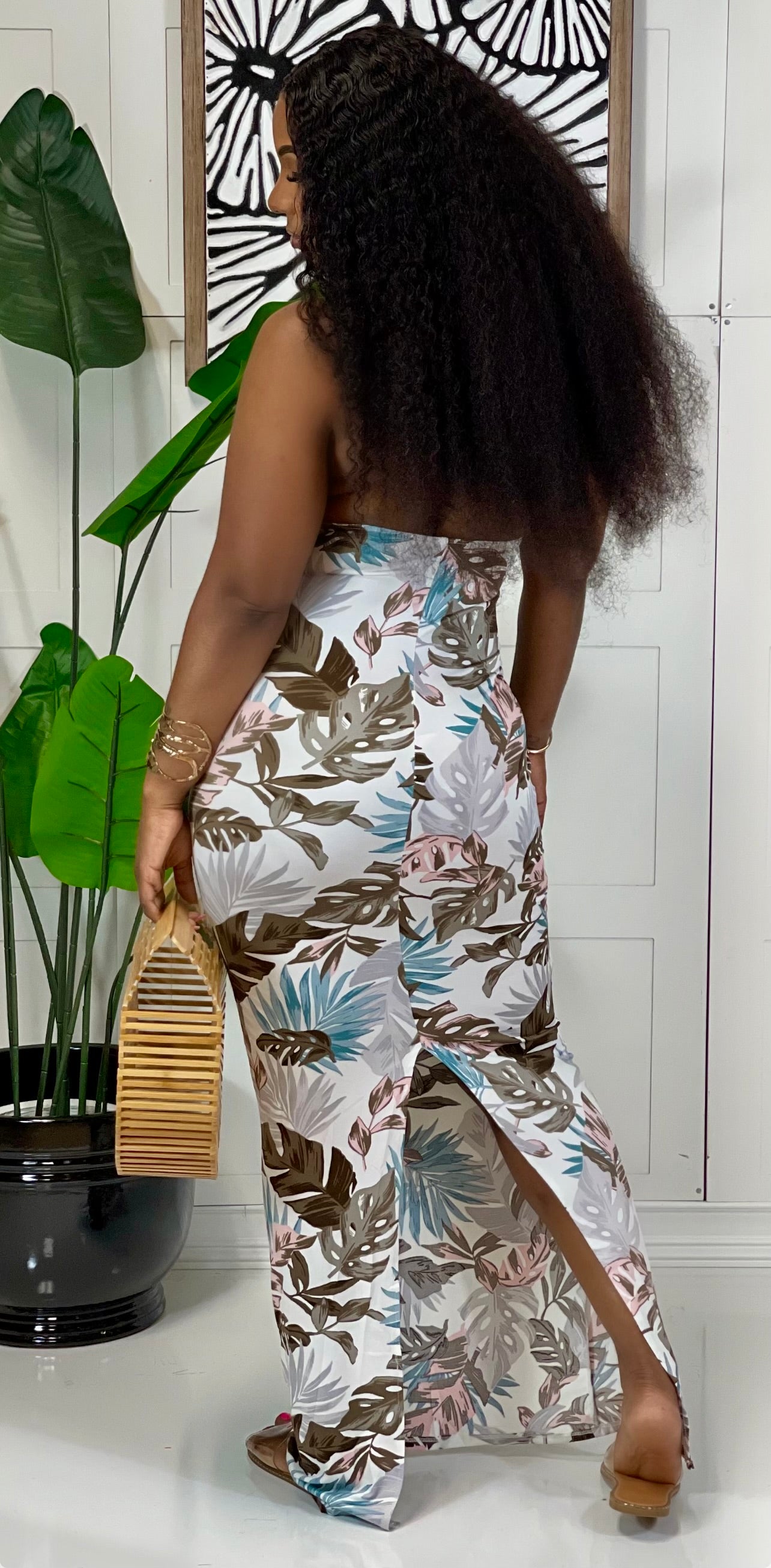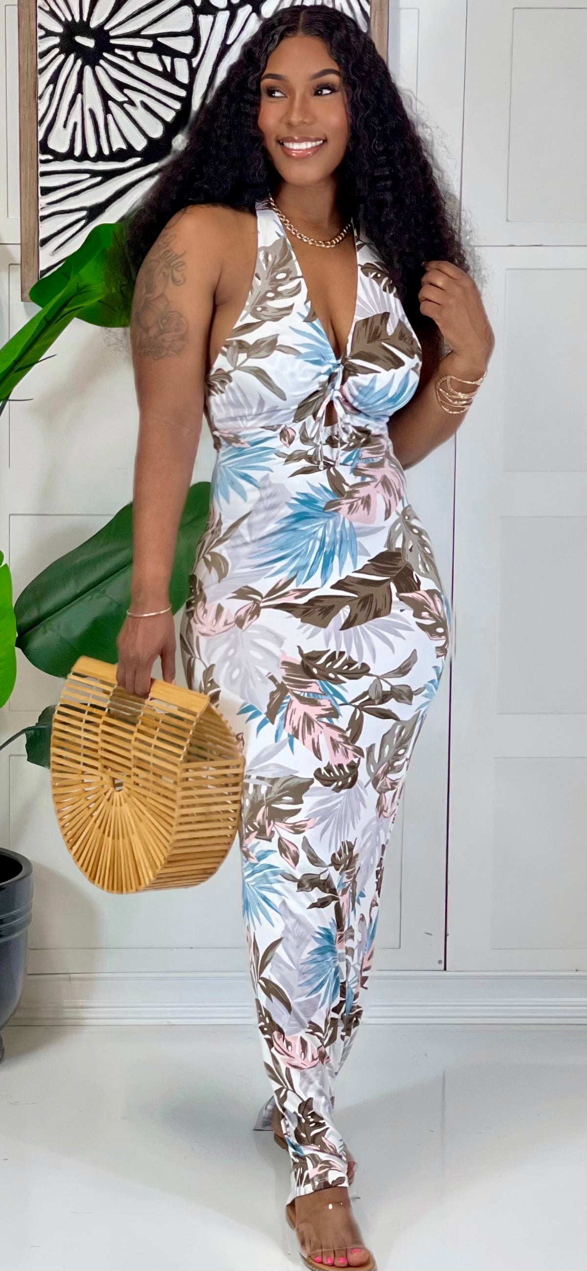 A fashionable sleeveless maxi dress in leaves pattern featuring a halter top with self-tie ribbon, an O-ring with drawstring and shirred details, cutout, and a back slit. Made in Cambodia