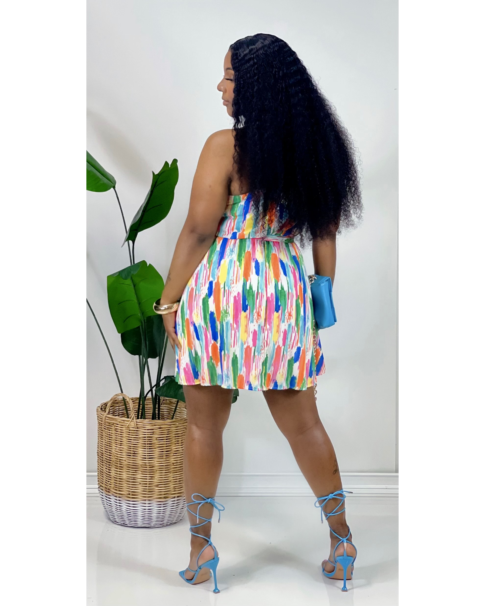 Abstract Print One Shoulder Mini Dress - Short sleeve - Elastic waist - Woven - Belted