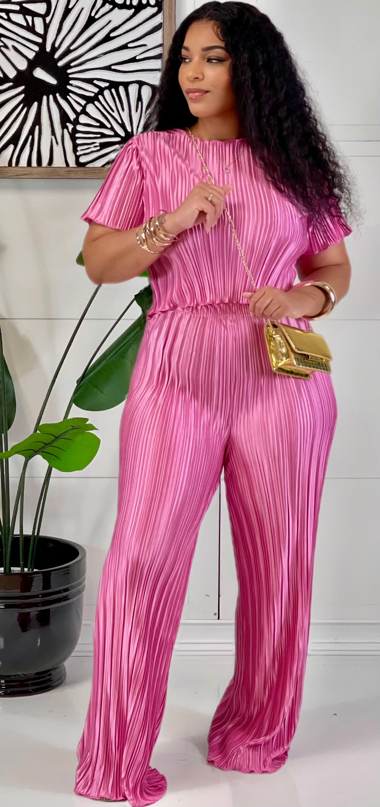 Add A Glam Touch To Your Look With This Matching Set. Crafted From Crinkle Plisse, The Top Has Short Sleeves And A Relaxed Fit Crop Bodice. The Matching Pants Feature A High-Waist That Leads To Wide Cut Pant Legs. 100% Polyester Model Is 5' 6" Tall, 32" Chest, 24" Waist, 32" Hips And Wearing A Size Small